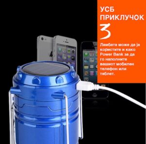 Ova lampa poseduje **USB izlaz** preko koga možete puniti svoj **mobilni telefon, tablet ili druge uređaje** 📱🔋 – sjajno rešenje u prirodi ili u slučaju **nestanka struje** ⚠️